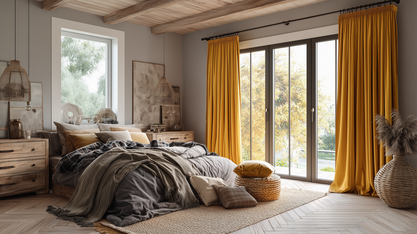Modern Living Room Style with Fully Blackout Golden Ochre Velvet Curtains